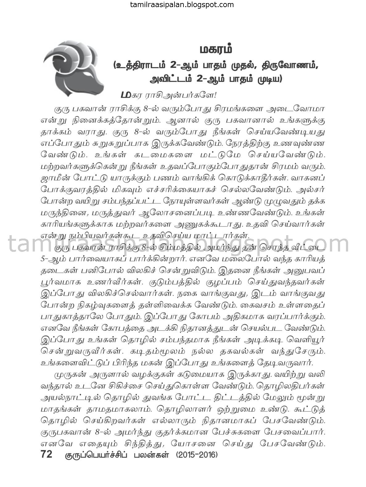Guru Peyarchi Palan for Makaram Rasi for the period 2015-2016. Read complete 8 pages Guru Peyarchi forecast online.
